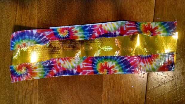 Corte otro pedazo largo de cinta de la misma longitud. Cortar por la mitad. Colocarlos a cada lado de la primera tira.