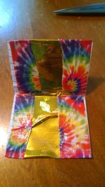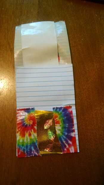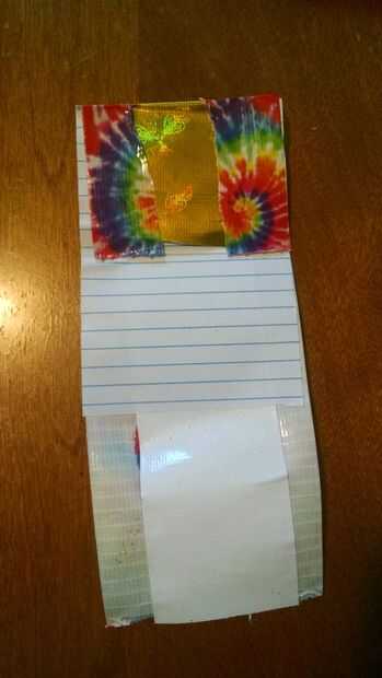 doblar la pestaña inferior de la cinta hacia arriba por lo que recorre aproximadamente la mitad del papel. Luego dobla el papel por la mitad. Voltee el papel y hacer lo mismo otra vez. Doblar por la mitad por lo que se asemeja a una pequeña carpeta.
