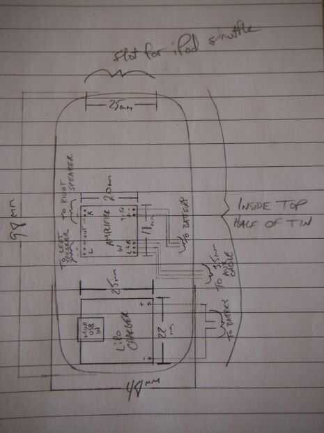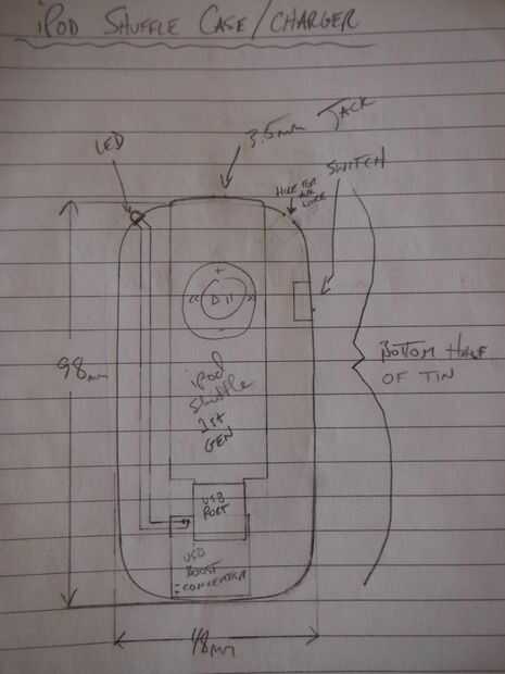 Mi diseño es bastante simple, que la parte más difícil fue hacer todo cabe en la lata y que todavía capaz de cerrar. Basé mi diseño en mi iPod. La baraja original es algo único en que tienen un conector USB macho incorporado, por lo que no necesita un cable para conectar a la carga o sincronización. Todavía uno de mis diseños favoritos Apple nunca ocurrió. Yo diría que el diseño alrededor de tu reproductor de MP3 es el mejor enfoque, ya que todas las otras piezas internas son bastante genéricos cuando se trata de tamaño y forma.