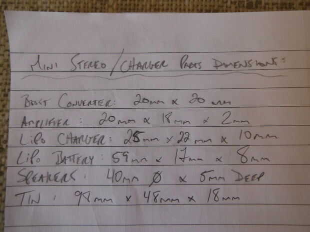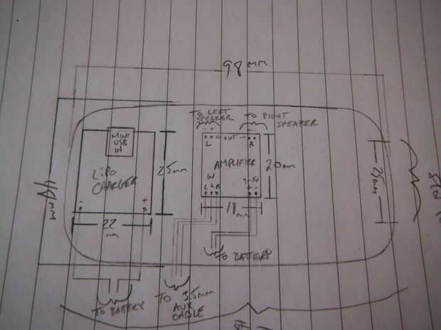 Todo lo demás va en la tapa. Decidió montar mis altavoces en el exterior de la tapa y perforado sólo dos pequeños agujeros para los cables en la bandeja de la alimentación. Esto ahorra espacio valioso dentro de la bandeja para sus otras piezas. La Junta Directiva de amplificador y LiPo carga junta ambos Haz montado en el interior de la tapa. Sólo asegúrese de que usted coloque el cargador LiPo en un área que usted puede acceder a él de puerto de carga sin obstrucciones cuando se tiene un cable conectado a él para cargar la batería (tipo de jury-rigged mina... más en profundidad en el paso 6).
