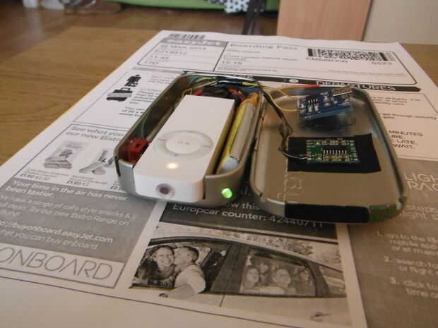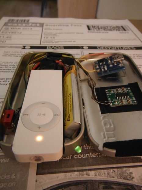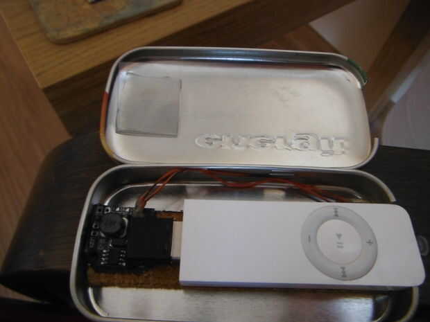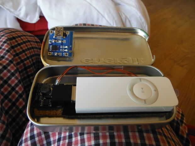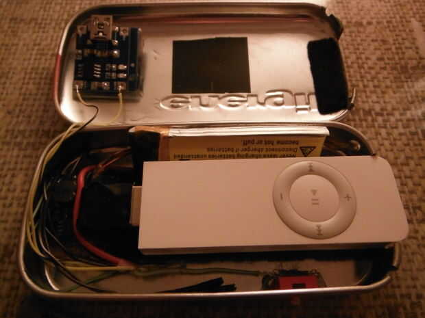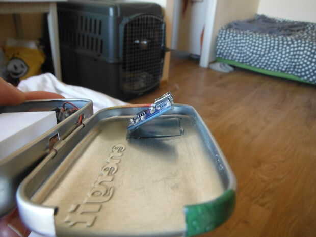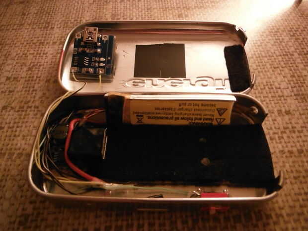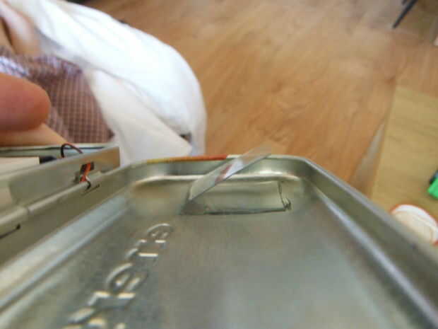 Para montar el cargador en la lata y todavía tengo claro todo, tuve que ordenar del aparejo del jurado. I cortar una pieza de plástico de un cartón de huevos dos veces el área del cargador, había doblado por la mitad y había pegado el cargador a él. Luego lo pegué abajo dentro de la tapa de la lata. El propósito de esto es que el plástico actúa como un resorte. Cuando la lata esté cerrada, comprime. Cuando la lata está abierta, aparece por lo que puede conectar un cable en el cargador a energía y recargar la batería.