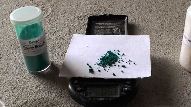 Acetato de cobre (II) http://www.sigmaaldrich.com/MSDS/MSDS/DisplayMSDSPage.do?country=US&language=en&productNumber=326755&brand=ALDRICH&PageToGoToURL=http%3A%2F%2Fwww.sigmaaldrich.com%2Fcatalog%2Fproduct%2Faldrich%2F326755%3Flang%3Den