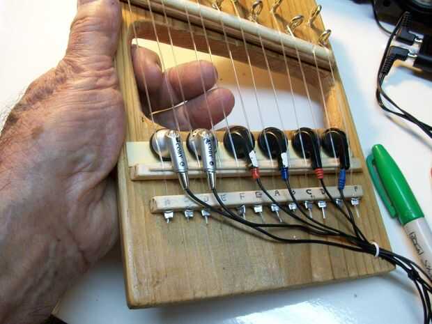 Entonces, lógicamente, preguntamos ¿por qué no más cadenas que cubre una octava y una mitad? Así agregamos más audífonos como pickups y low behold la lira miniatura nació. Ser una lira que instrumento musical tenía que tener un centro abierto para que la mano izquierda para tocar cuerdas también. Un agujero fue perforado y una sierra de marquetería se rosca a través de él y cortamos una zona centro. Resultados típico Lira.