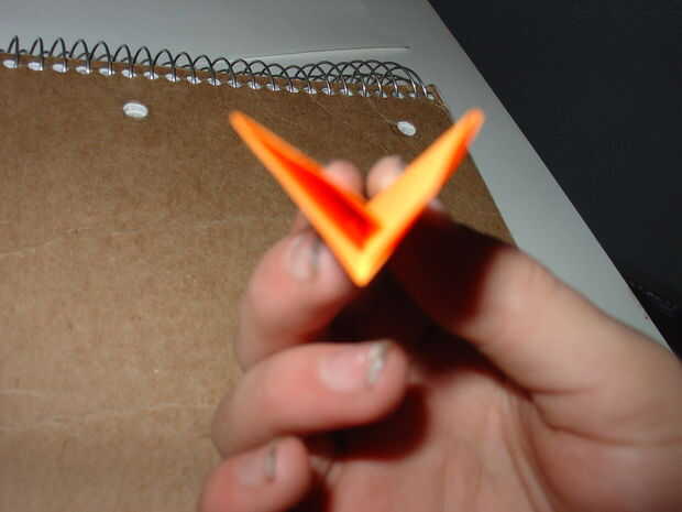 Doble en los lados del plano, debe haber dos puntos en la parte trasera del avión. (Mirar las fotos). Doblar por la mitad otra vez.