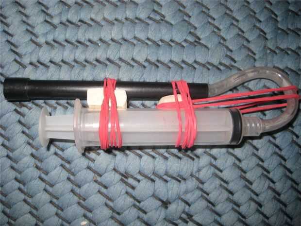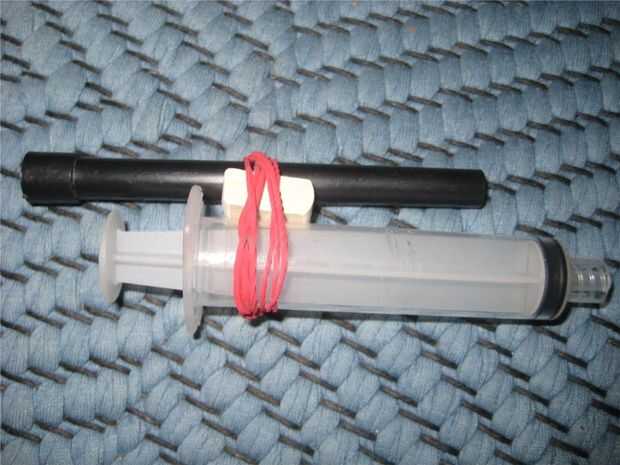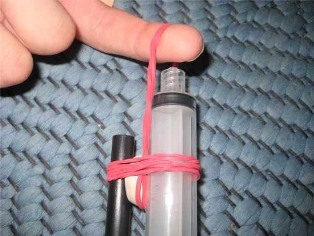 1. Fije el tubo y el borrador a la jeringuilla con banda de goma (imagen de reloj) 2. es difícil de explicar así que tome un vistazo de la segunda foto 3. Conecte la manguera (puede necesitar pegamento) 4. usted tiene un arma!