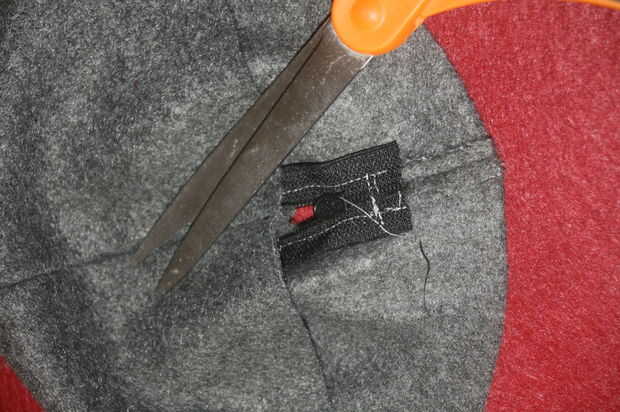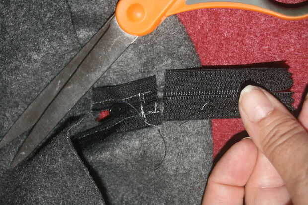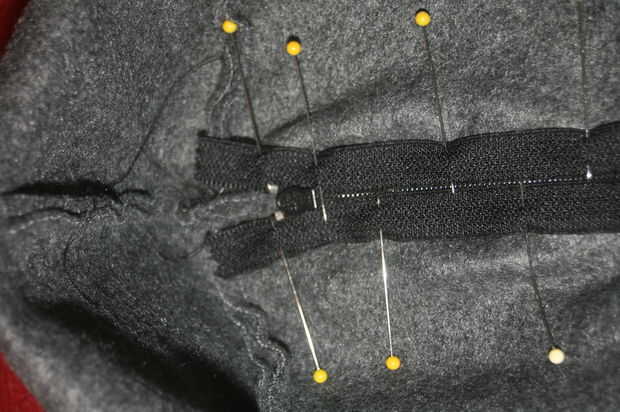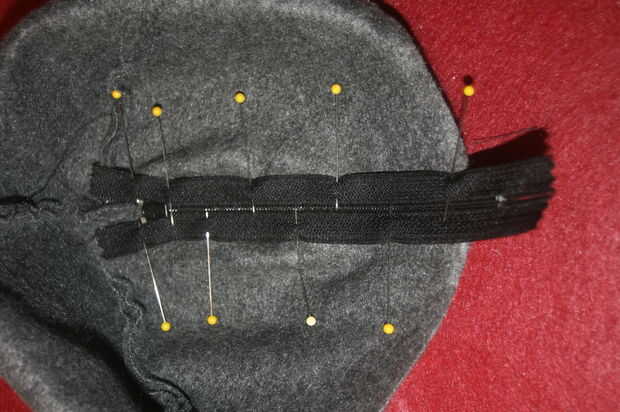 Tomando el lugar más pequeño de la cremallera hacia abajo en el interior de la corona, correr la cremallera a lo largo de la costura basted. Prender cuando cose la cremallera se abrió y revelado en la costura en la parte exterior del sombrero.