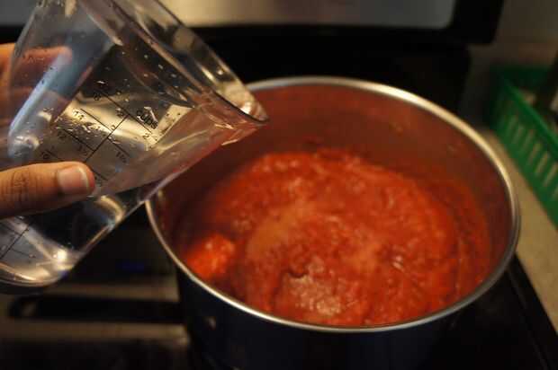 5) añadimos el tomate triturado y una taza de agua.