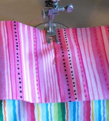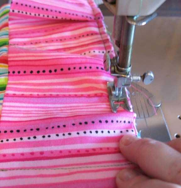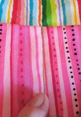 Cuidadosamente, coser la tira de bolsillo en el respaldo. Coser a lo largo de cada línea de bolsillo pin marcado, quitando los pernos para que no dañe la máquina.