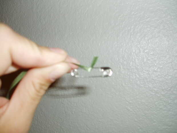 Cortar un trozo de cinta que es mucho tiempo para ir en la parte superior de la bolsa con abundante izquierda para atar apagado el lazo. Acople un extremo de la cinta a su pin de seguridad. Esto hace mucho más fácil ensartarla a través. Pase la cinta por la parte superior de la espalda con el pasador de seguridad para dirigir la cinta.