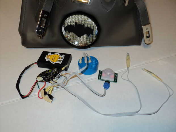 Electrónica para proporcionar el circuito de reproductor alarma y sonido intermitente. He utilizado una placa de Arduino usable Adafruit Flora que usé anteriormente para mi bolso de compras de IKEA TARDIS.
