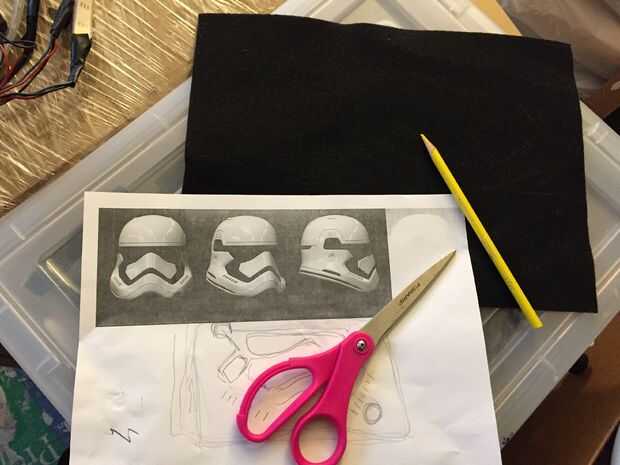 Hice la parte de la rejilla del casco por las tiras de costura negro de fieltro en un pedazo de fondo blanco. Será más fácil de manejar una pieza grande en lugar de las 7 marcas de rejilla fina para cada lado.