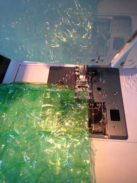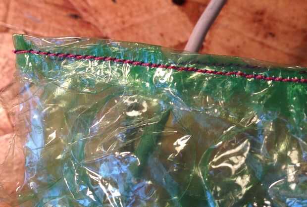 Un Consejo general - este material es un poco más difícil para que otros plásticos. Las burbujas tienden a ponerse en el camino y atasco de la máquina. Cosa lentamente y perforar pequeños agujeros en las burbujas mientras se cose.