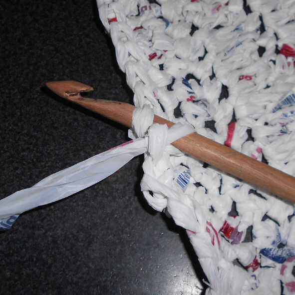 Repita el proceso de pasar de un extremo de la fila a otro hasta que haya filas de 36 a 40 en total. Se trata de la sección delantera de la bolsa.