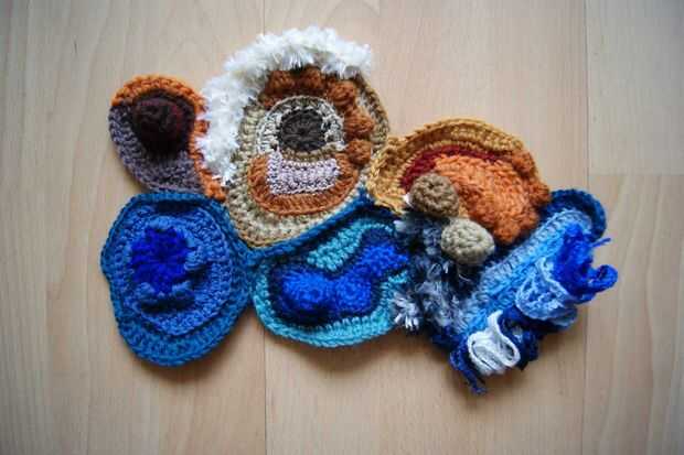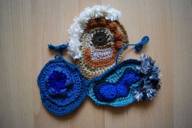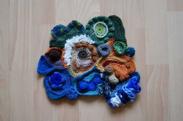 hice este embrague en crochet freeform, cada lado se hace por separado y diferente, hasta que estén tan cerca de la misma forma como puedo conseguirlos. Luego utilice un solo ganchillo para unir las dos partes, una abertura de alrededor de 3,5 pulgad