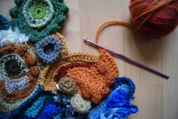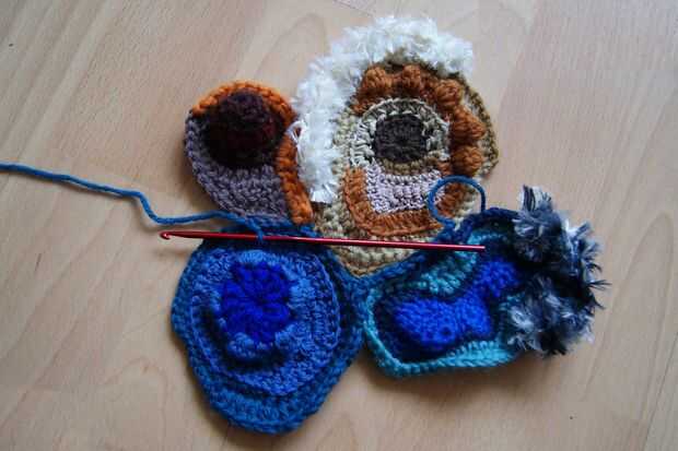 Estas fotos muestran como las scrumbles fueron añadidos y cosidos encima (hay algunas piedras cosidas en demasiado).  El lado derecho del panel debe ser más amplio y se puede ver donde yo ganchillo una hilera de puntadas dc directamente sobre la pieza.