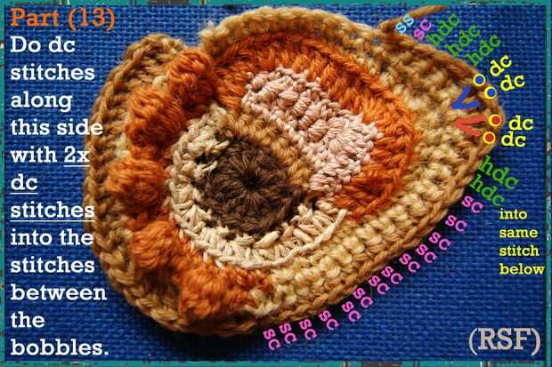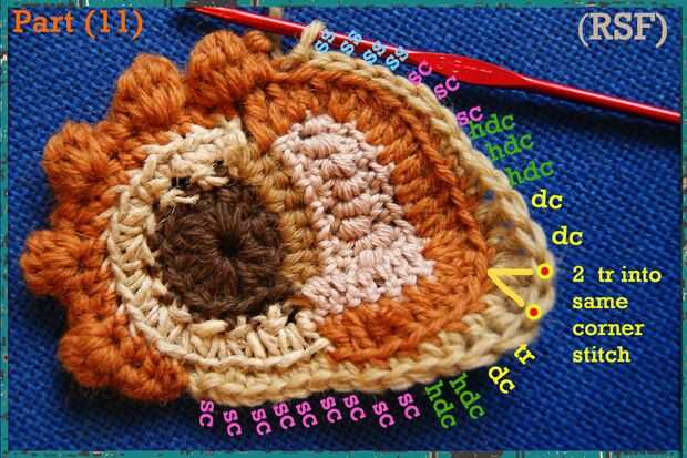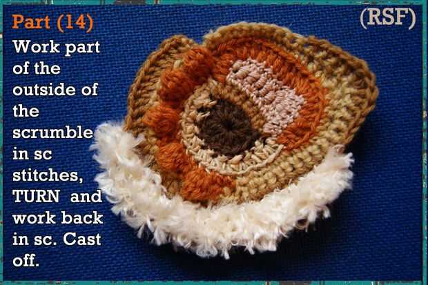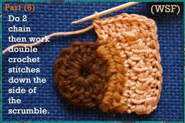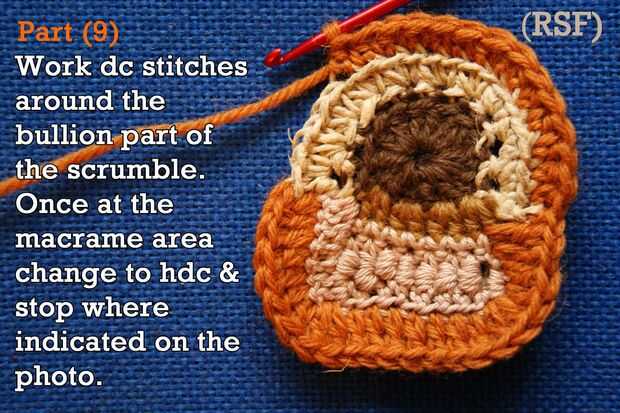 Un scrumble freeform no sigue un patrón porque la diversión está en toma de decisiones como el scrumble evoluciona, pero con el propósito de este tutorial he añadido detalles a las fotos de la scrumble para que pueda entender cómo se hizo.  A veces el ganchillo es el lado derecho del trabajo y a veces el lado equivocado del ganchillo.  Como hice este scrumble que entregaron el trabajo cada vez que queria cambiar de dirección y trabajó a veces sólo en el lazo delantero de los puntos más abajo.  Siempre que sea posible, llevar los extremos sueltos de los hilos a lo largo de la obra cortar coser demasiados cabos sueltos.
