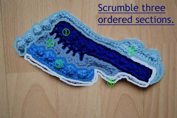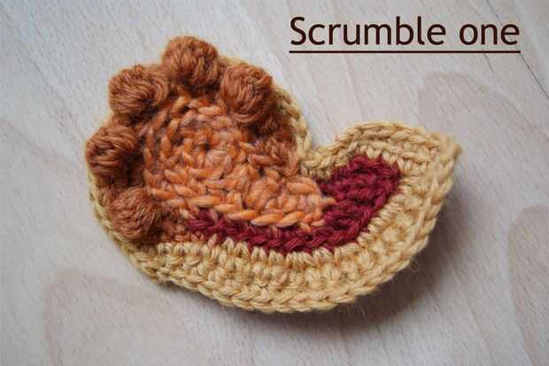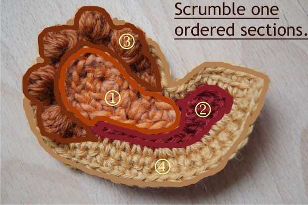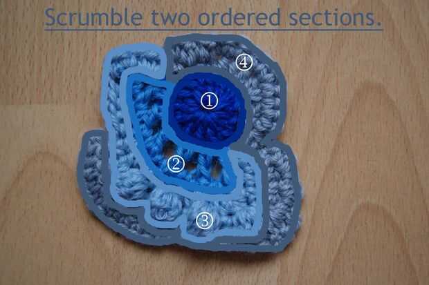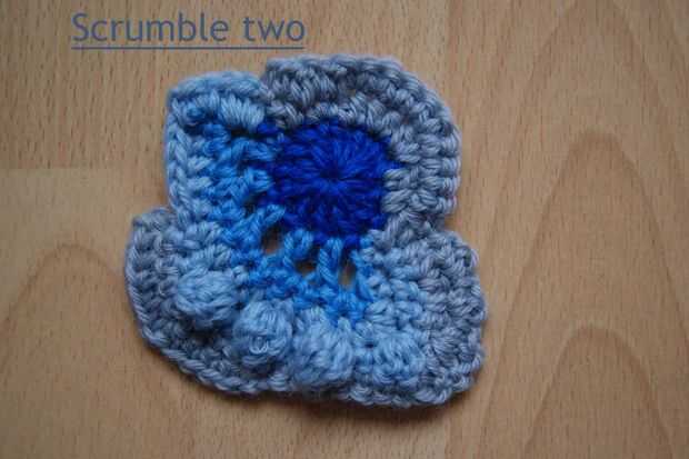 Esto paso tres scrumbles diferentes toques e ilustra cómo las secciones se construyeron para arriba/ordenado.  Parte de la alegría de crochet freeform es cambiar puntadas y trabajando una variedad de diferentes puntadas en el scrumbles. Estos tres tienen sc, dc, tr, motas, conchas, una puntada de textura había llamado cáscara de limón y levantaron puntos de sutura.  Te sugiero que mires en you tube vídeos explicando estos puntos en detalle, si desea utilizar ellos u otros puntos de la textura.  Aprender puntos nuevos e inusuales ha sido parte de la diversión de forma libre.