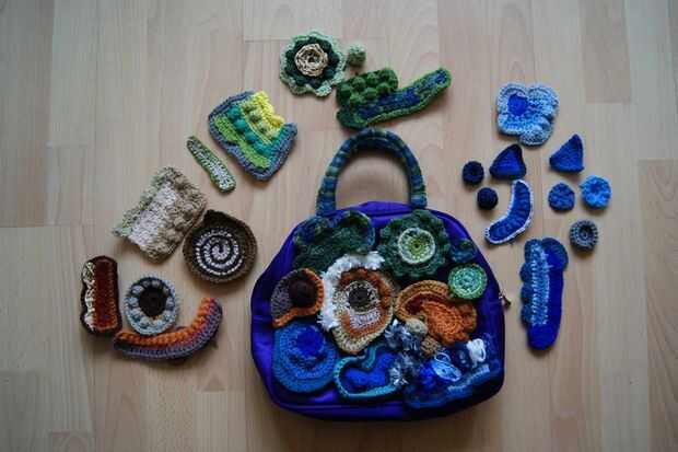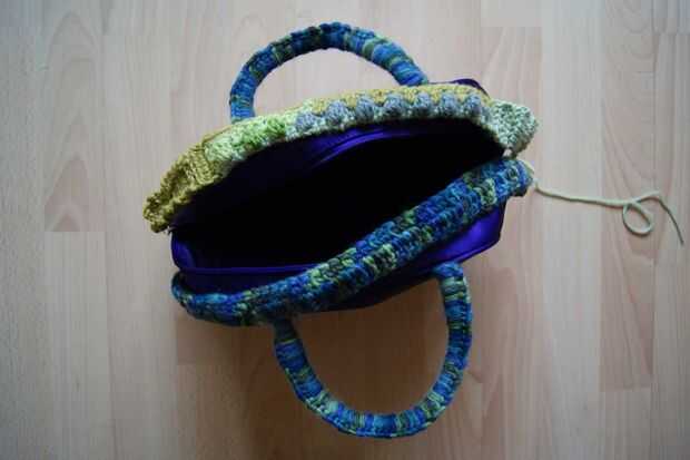 hice este embrague en crochet freeform, cada lado se hace por separado y diferente, hasta que estén tan cerca de la misma forma como puedo conseguirlos. Luego utilice un solo ganchillo para unir las dos partes, una abertura de alrededor de 3,5 pulgad