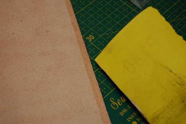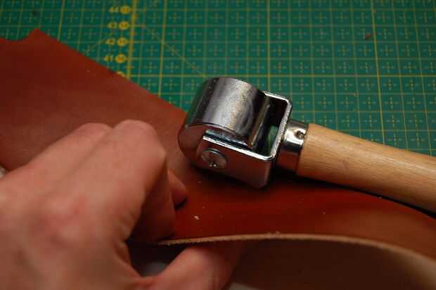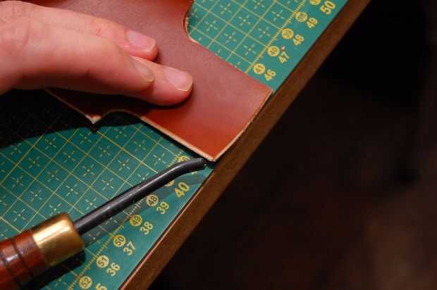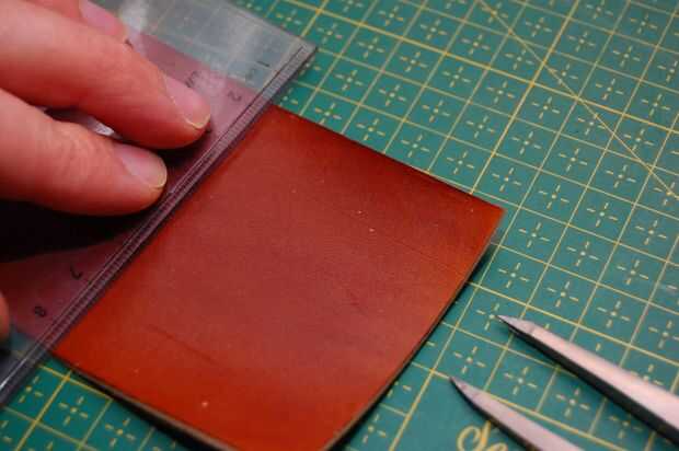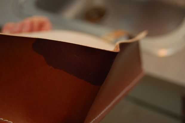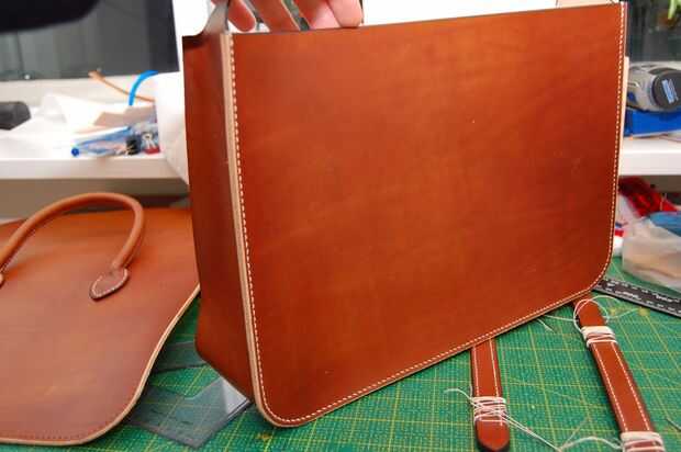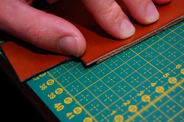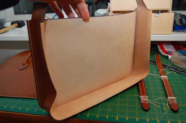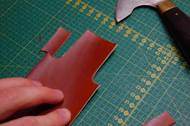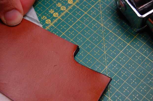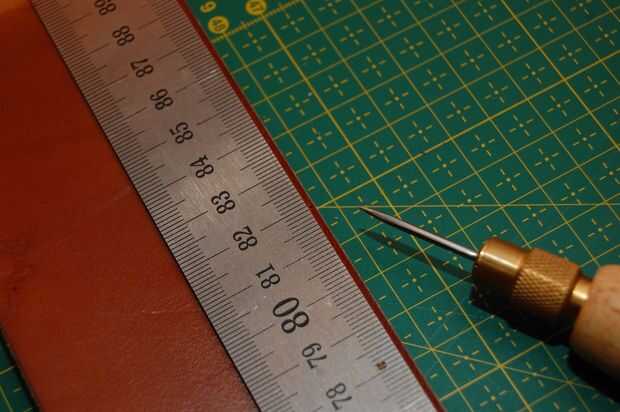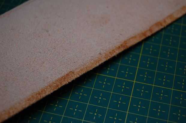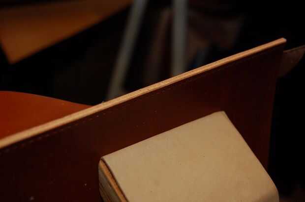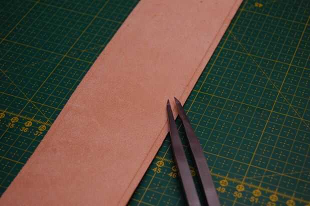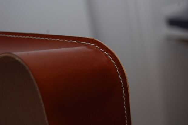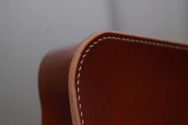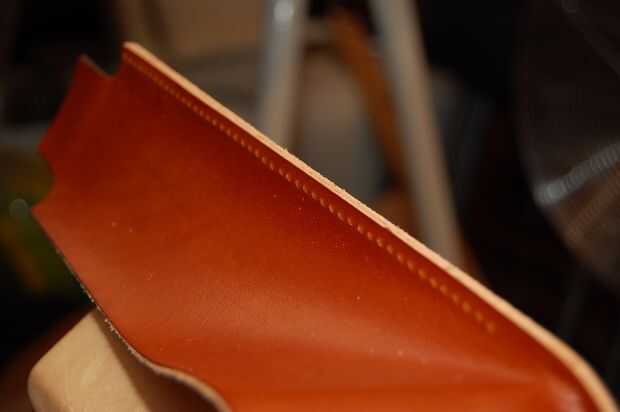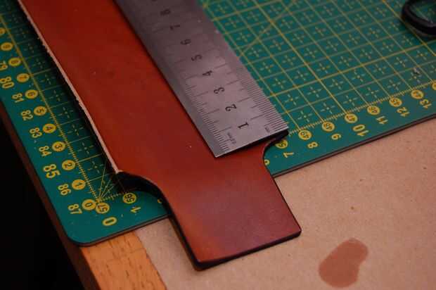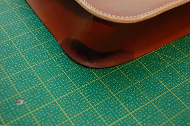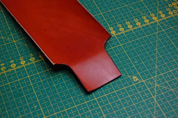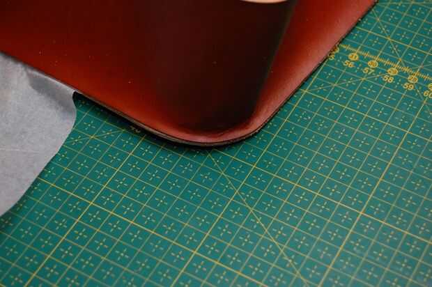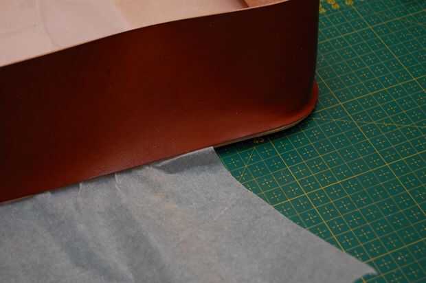 Bolsos de encargo modo el patrón a lo largo del camino. Una de las partes que cuesta más es determinar la longitud de la escuadra. En teoría no debería ser tan difícil. Se trata simplemente de calcular la longitud de tres lados en la pieza frontal donde se unirá a la escuadra. En este caso la longitud es de 82 cm. Uno podría pensar que la longitud de la escuadra debe 82cm. Que sin embargo no es el caso. Debe tener algo que ver con las esquinas. Tal vez estiran el cuero un poco al pegar abajo o tal vez si no totalmente, está alineado con el borde terminas con material extra al final. Eso fue lo que me pasó. ¿Tan exactamente cuánto material extra terminó para arriba con? ¿2 mm? ¿5 mm? lol. 8 mm demasiado! Eso es mucho así que la única opción es cortar el material extra. La próxima vez como Al Stohlman sugeriré en sus libros. Antes de cortar los extremos de la escuadra se pegue en lugar de con cemento de goma y marca los extremos. El cemento de goma le permite desmontar luego.