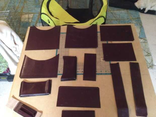 las piezas más grandes son panel posterior de la bolsa, panel frontal y aleta. Estas son las piezas con la curva de corte en ellos. la aleta es 1/2 pulgada más ancha y luego la parte delantera y trasera. La exterior parte posterior bolsillo y bolsillo trasero interior son pedazos de los paneles frontales y traseros del maletín. El bolsillo delantero es un bolsillo rescatado desde el interior del maletín y ya fue moldeado a la forma. Me decidí por un escudete lleno por lo que las piezas estrechas fueron cortadas por los lados y el escudete inferior. los lados tienen una leve forma cónica que hace la bolsa más amplia apertura en la parte superior. El bolso terminado es aproximadamente 8 pulgadas de ancho y 6,5 pulgadas de profundidad. sus 2 pulgadas ancho hacia delanteras en la parte superior y 1 pulgada en la parte inferior. Añadir 1/2 pulgada a estas dimensiones para las costuras de borde y la costura.