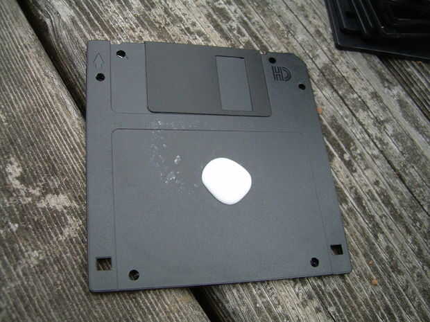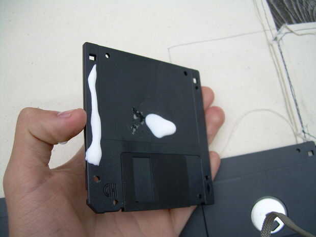 Aplicar un lenguado pequeño de su cola de elección en el disquete. Para los dos especialmente perforaron disquetes os recomiendo una pequeña línea de pegamento en el borde a la costura muy gruesa (ver segunda foto).