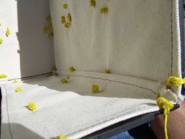 Doble para arriba el bolso y doblar las aletas dentro de modo que superpongan a la lona en el interior. Coser estos rincones, nudos en el exterior.