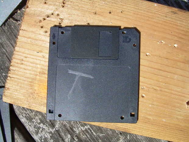 Con clavos y un tablón de madera, cree una plantilla en que usted puede deslizar una pila de discos. Asegúrese de que cuando los discos se sostienen en su lugar, que son cuadrados de la superficie están perforando en, esto hará que sus agujeros son perforados en el mismo lugar en cada disco.