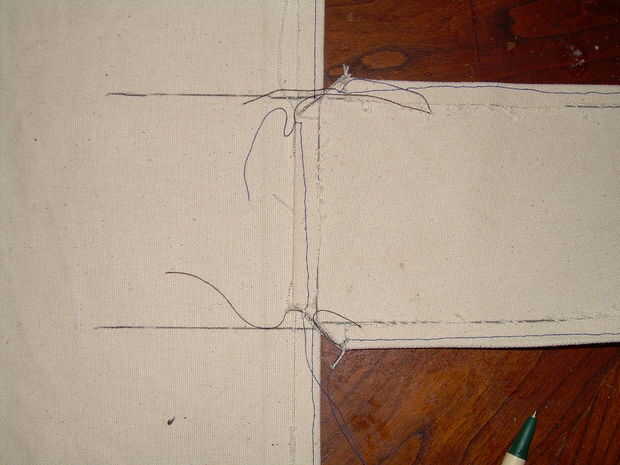 Doble sobre los lugares donde vas a coser los dobladillos. Recuerde dejar las aletas en las piezas laterales para permitir que la bolsa para plegarlo a la vez. La segunda imagen muestra lo que estas dos piezas deben. Cuando todos cosidos, coser la ficha inferior de los lados a donde estaban en la matriz. Ayuda a colocar los discos sobre la lona a encontrar este lugar. Ver la tercera foto para más detalles.