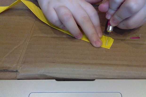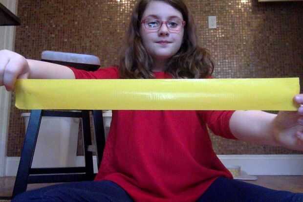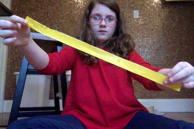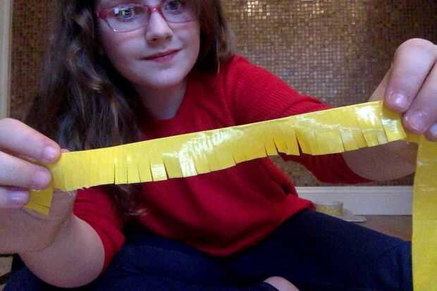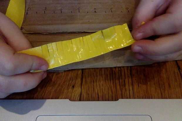 Tome una tira de cinta adhesiva sobre un pie y medio y luego doblar por la mitad verticalmente. Ahora corte pequeñas ranuras a través de la tira entera no corte de la franja completamente.