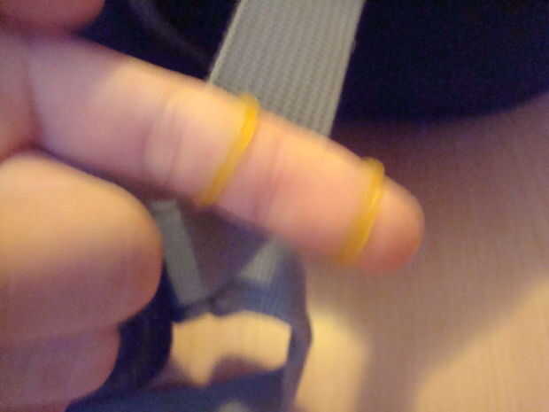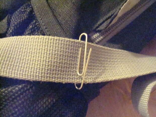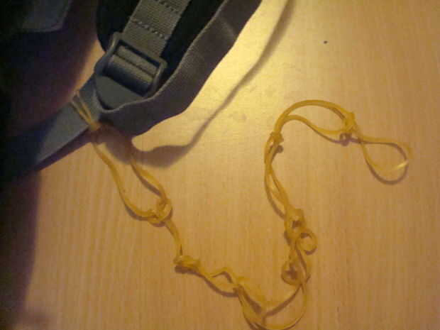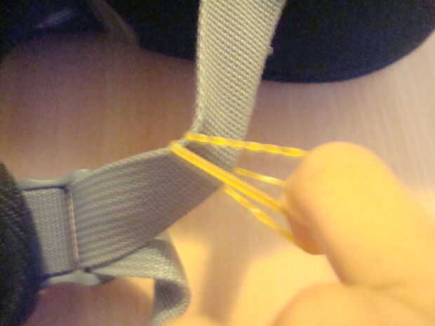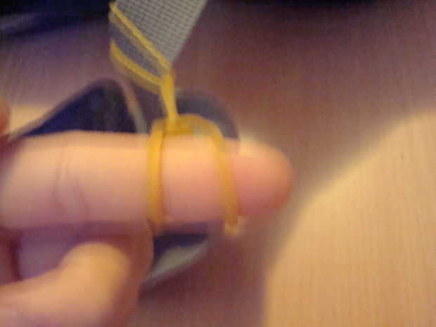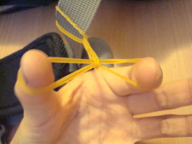Crear una cadena de bandas de goma como se muestra en las fotos. Luego coloque un clip para la correa frente a la que inició la cadena.