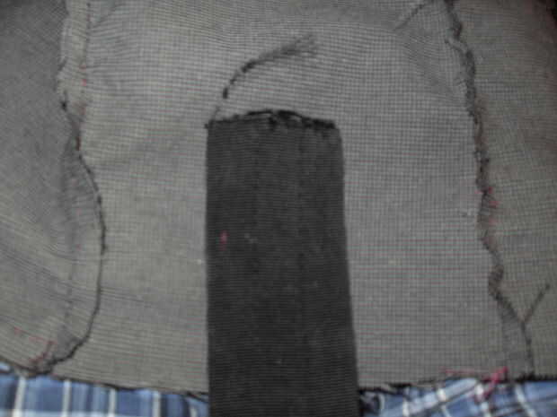 Hacer una correa, o salvar a uno. Podría utilizar a algún retazo de la correa, o puede utilizar una correa de una mochila rescatada, o un viejo cinturón de seguridad, o una correa vieja, etc.. Coser a la tela exterior de los paneles laterales (o utilizar cinta adhesiva para conductos, no digo si no).