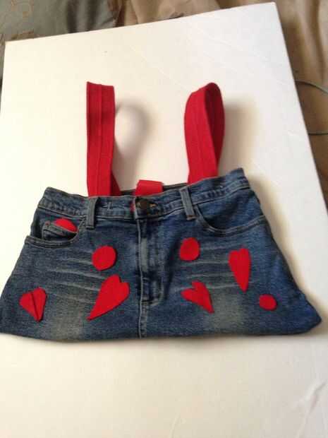En mi ejemplo cortar algunos denim rojo y había aplicado con pegamento para tela y también voy a y las manijas son de un cinturón viejo.