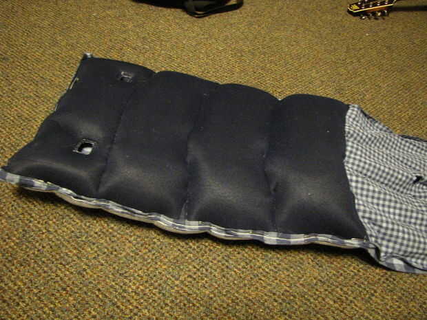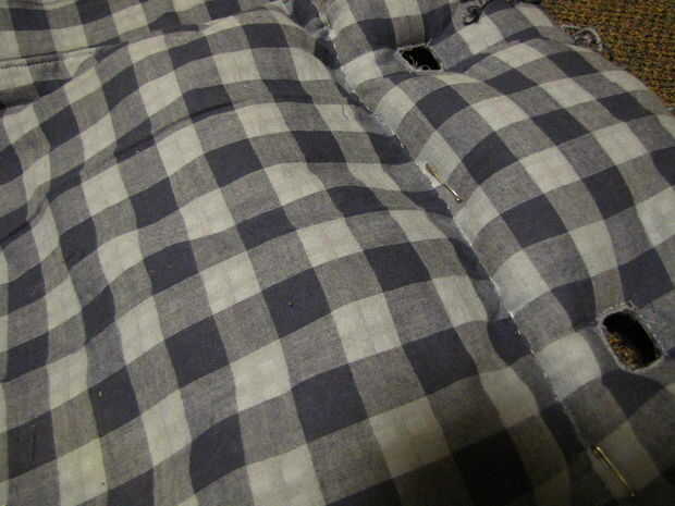 En la parte posterior de la bolsa comencé a comprar poniendo suficiente poly-fil en hacer hinchada pero no excesivamente rígido. luego cosí hacia abajo la bolsa longitudinalmente. Hice esto 4 veces hasta que llegué a la parte superior de la tela interior. Si seguiste mi consejo para hacer la tela interior más largo, usted probablemente tendrá un par más.