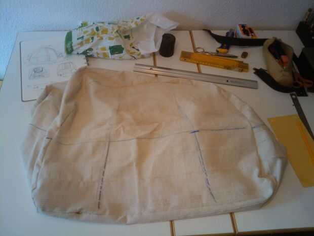 La parte inferior está hecha de dos capas de lona de la tienda. La capa externa está hecha de una parte con la abertura para el mango (frente), una parte que cubre la placa base y una tercera parte que forma la parte de atrás y sirve como amortiguador si la medición está mal;-). La capa interna está hecha de una sola pieza, bruja contiene una cremallera en el centro para insertar la placa y fijar las ruedas y manejar más adelante.