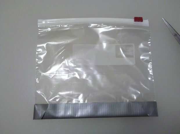 Luego cortar un trozo de cinta que es aproximadamente 2 pulgadas de más de dos veces el ancho de la bolsa. De esta manera puede cubrir ambos lados y tiene una superposición de 2 pulgadas. Centro de la cinta en un lado de la bolsa para que quede derecho y envolverá alrededor cuidadosamente al otro lado. Voltea la bolsa y aplicar uno de los extremos, luego traslapo con el otro extremo de la cinta.