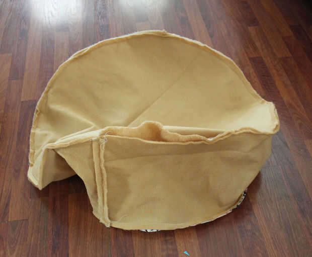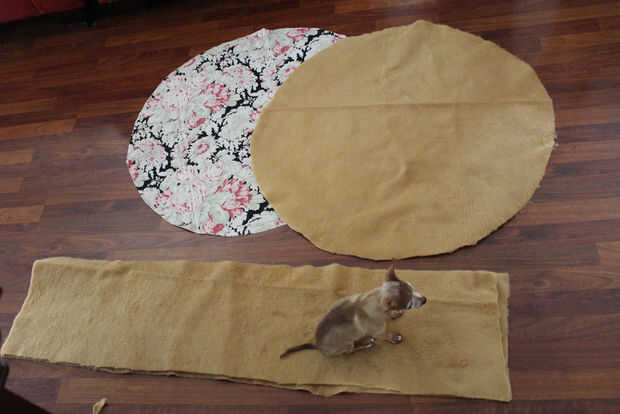 Cortar dos círculos de diámetro 34 pulgadas (uno en el color de la miel, el otro en cualquier tejido, para la parte que toca el piso). y una tira de 12 pulgadas de alto y 104 pulgadas de largo.