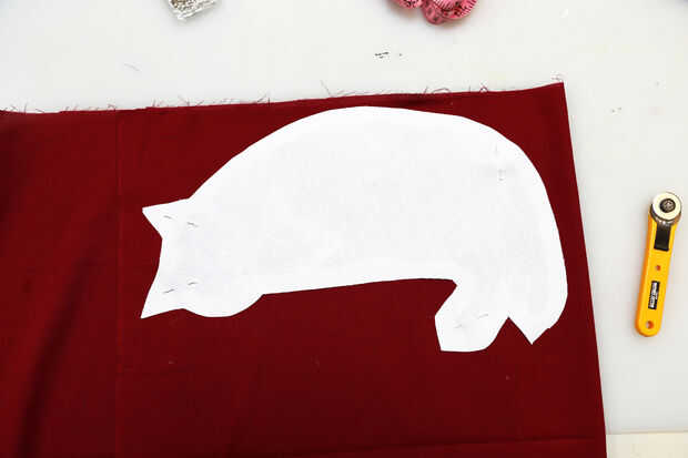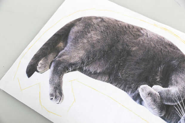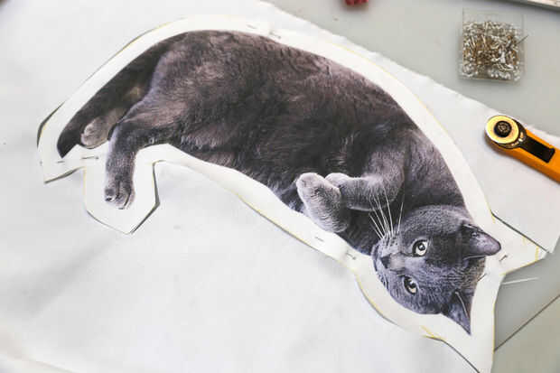 Tomar una tiza de gobernante y de la tela y marque 1" desde el borde de todo alrededor de la imagen. Recortar la imagen del gato con el margen de 1" y utilizarlo como una pieza de patrón para la parte posterior de la bolsa y forro. Procedemos a cortar el resto de las piezas para el bolso como tal: