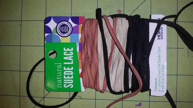Me gusta usar cordón de gamuza de walmart. Cortar sobre una longitud de las manos y me ató ambos extremos en nudos.