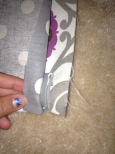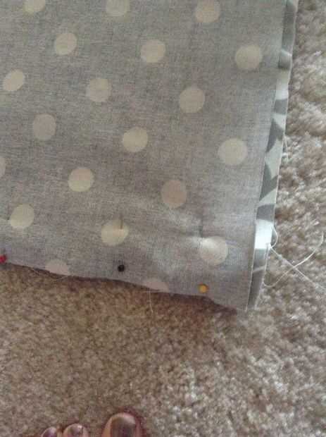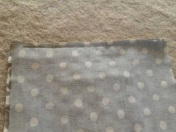Capa de tejido exterior y forro, derecho. Inserte el borde crudo/plegado de la caja entre las dos piezas, alineando el borde crudo/doblado con los bordes crudos de la guarnición y la tela del bolso. Perno en su lugar. Costura con un margen de costura de 1/2". Repita con el lado opuesto.