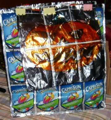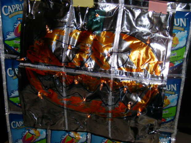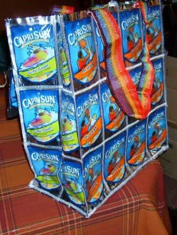 usé una máquina de coser con hilo de nylon pesado para coser juntos los paquetes de jugo Capri Sun! La parte más difícil fue limpiarlos antes de su uso. Yo les enjuagar en una mezcla de agua y lejía, asegurándose de que el enjuague tiene dentro del p