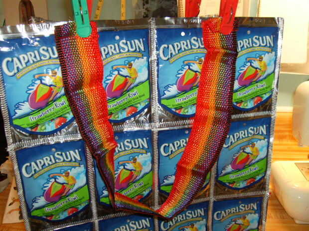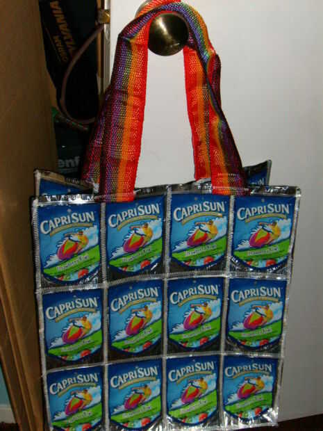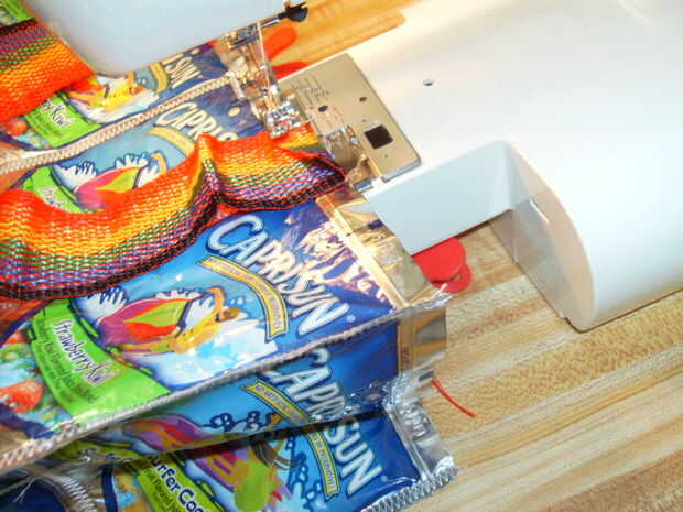 usé una máquina de coser con hilo de nylon pesado para coser juntos los paquetes de jugo Capri Sun! La parte más difícil fue limpiarlos antes de su uso. Yo les enjuagar en una mezcla de agua y lejía, asegurándose de que el enjuague tiene dentro del p