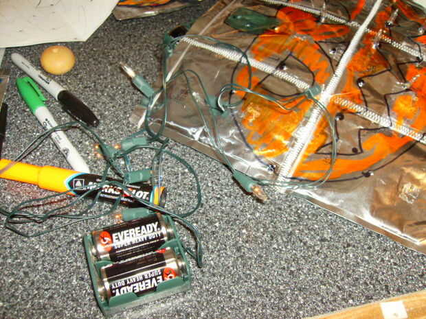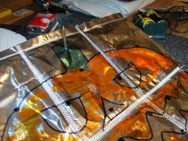 Panel clip light-up en la parte superior de un lado de la bolsa, en lugar de recorte permitirá otros usos de la bolsa después de Halloween. (coser si desea)