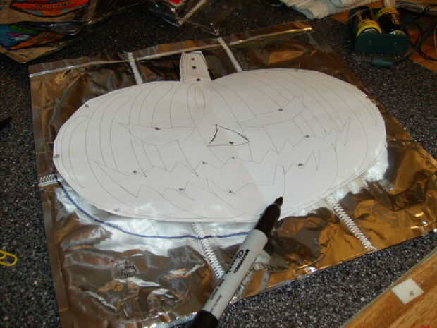 Utilizar un patrón de calabaza o mano dibujar la calabaza en la plata parte del panel. Uso permanentes responsables de color la calabaza ya que permite el "brillo" vienen a través.
