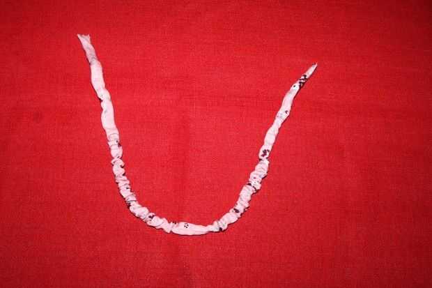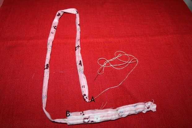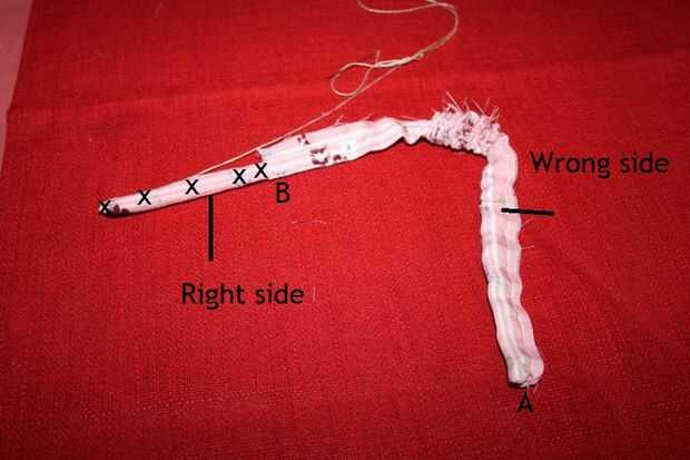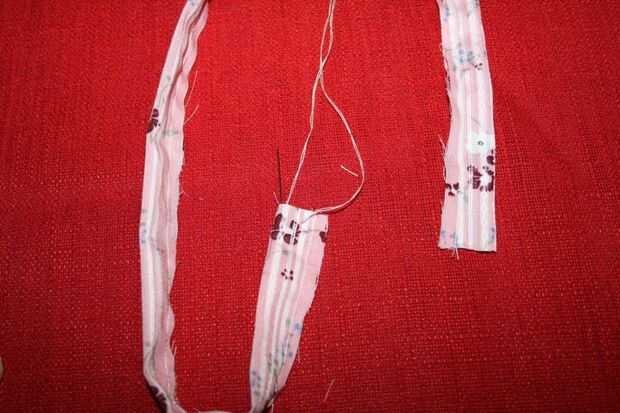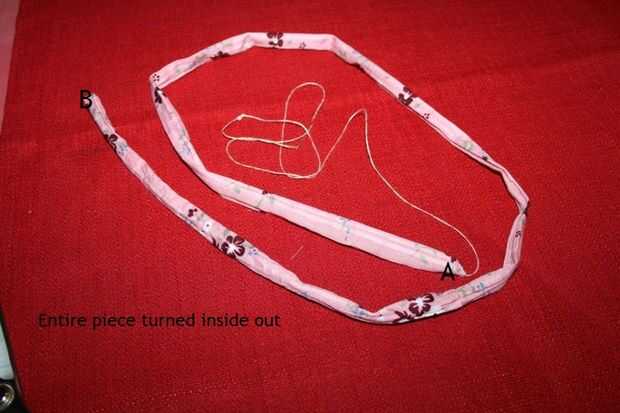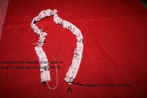 En un extremo de la pieza de coser muy bien doble nudo. Luego inserte la aguja a través de detrás. (pic4) Seguir recogiendo a la tela y pase la aguja y sacar desde el otro lado. No importa cuánto tiempo y estrecho su tela este es la forma más fácil de darles vuelta adentro hacia fuera.