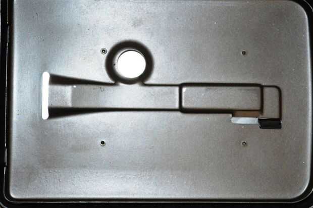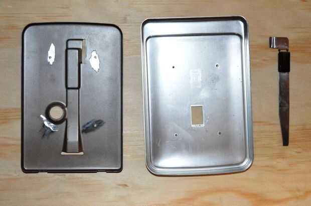 1. hay 4, pequeños remaches que sujetan una pequeña al frente de la puerta. Con una herramienta giratoria, moler estas con un poco lijado.