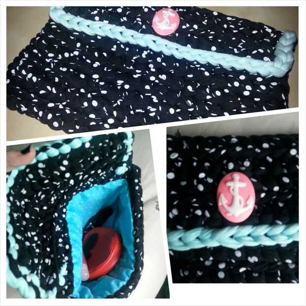 Este es mi bolso de mano casera hecha de hojas de aluminio (latas de cerveza), una camiseta vieja, bambú, perlas, alambre, lengüetas de tiro e hilo de ganchillo. Es ideal para esconder tus cosas de ganchillo u otras cosas.Me encanta reciclar y re-pro