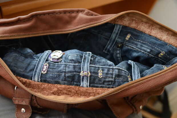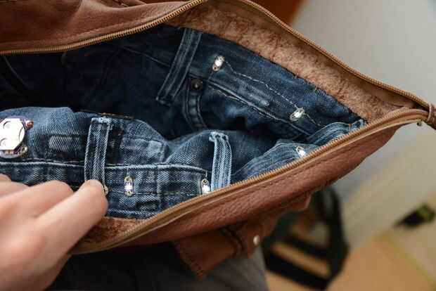 Invierta el jean para que pueda poner en la bolsa y poder acceder a sus bolsos. Coser juntos los agujeros donde las piernas donde.