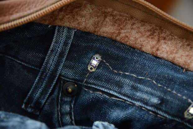 Para la luz LED coser la batería, el interruptor-on/off, botón y todos los LEDs en los pantalones vaqueros por lo que iluminan la parte interior de la bolsa según el diagrama.