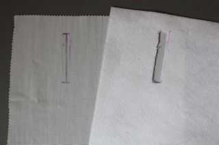Una vez que tienes tus ojales cosidos, puede Coloque el lado del forro de la bolsa contra el exterior y con un lápiz pequeño, marcar donde están los ojales sobre la entretela pesada.  Una vez que tienes las posiciones marcadas, podrás ver donde te sientan en el lado opuesto de la bolsa.  Puede crear una pequeña ventana para el cableado de LED e incluso cortar la tela de forro para doblar para limitar el desgaste.  Cosí este forro directamente a la interfaz para crear la ventana.
