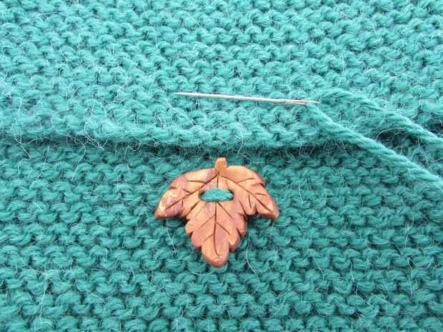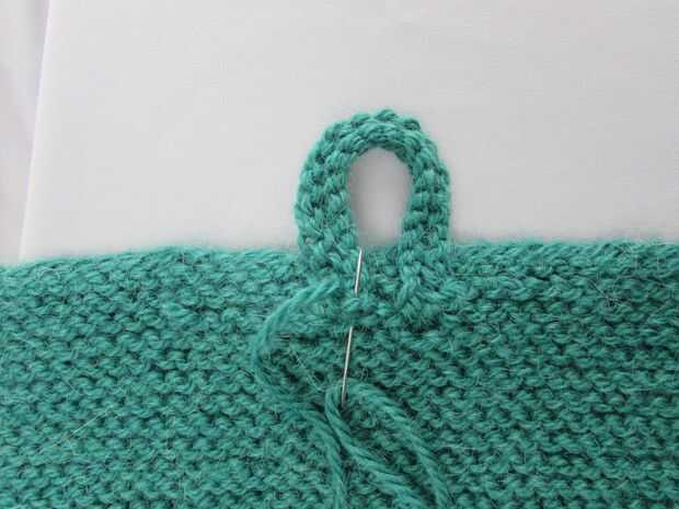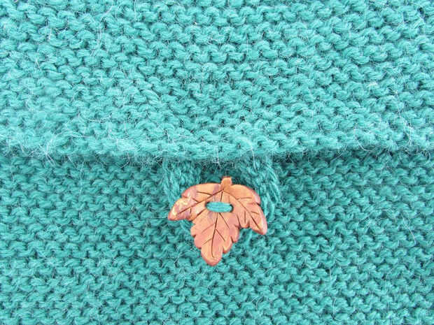 Para hacer el lazo del botón, lanzar 20 punto. Tejer 3 hileras y luego enlazar de las puntadas. Coser los extremos del bucle a la parte media de la aleta de la bolsa.